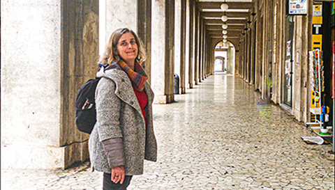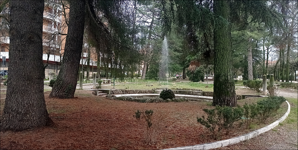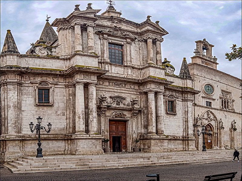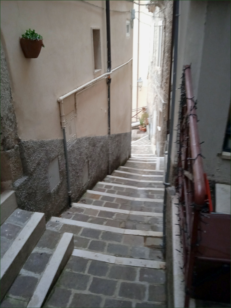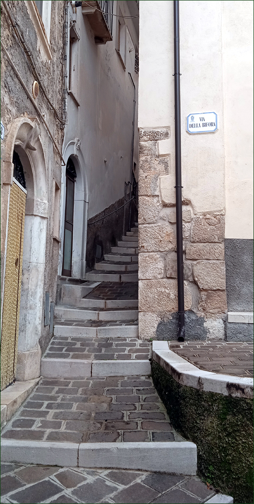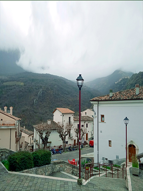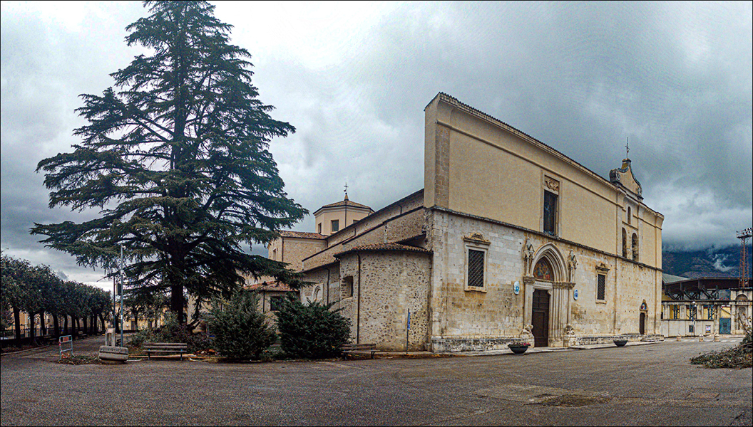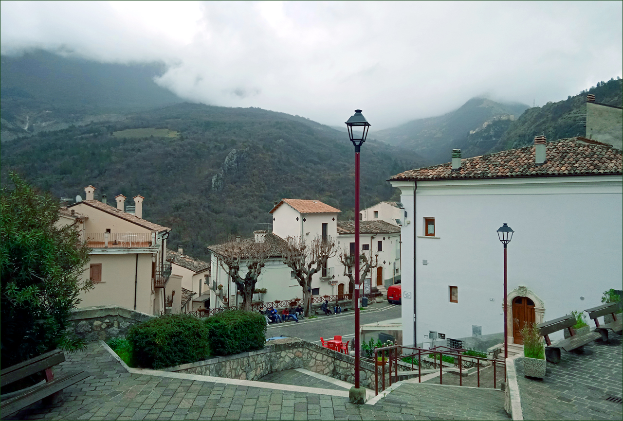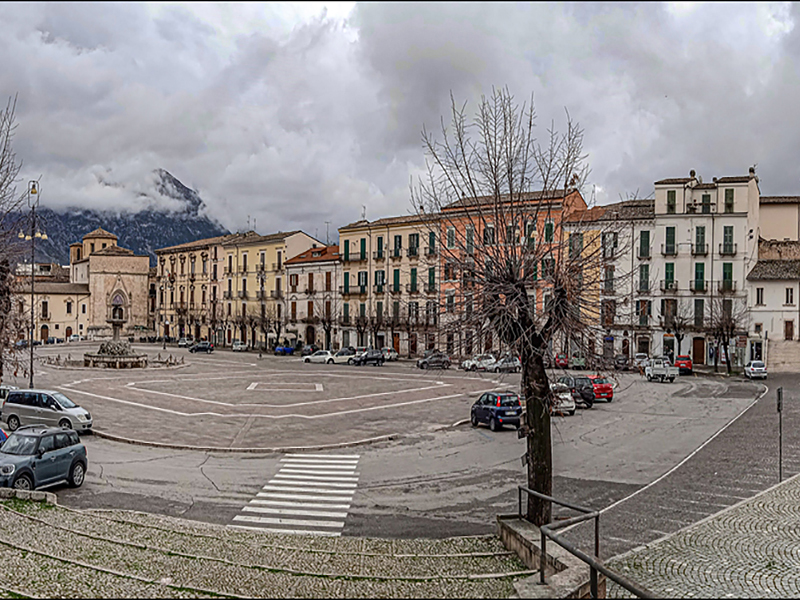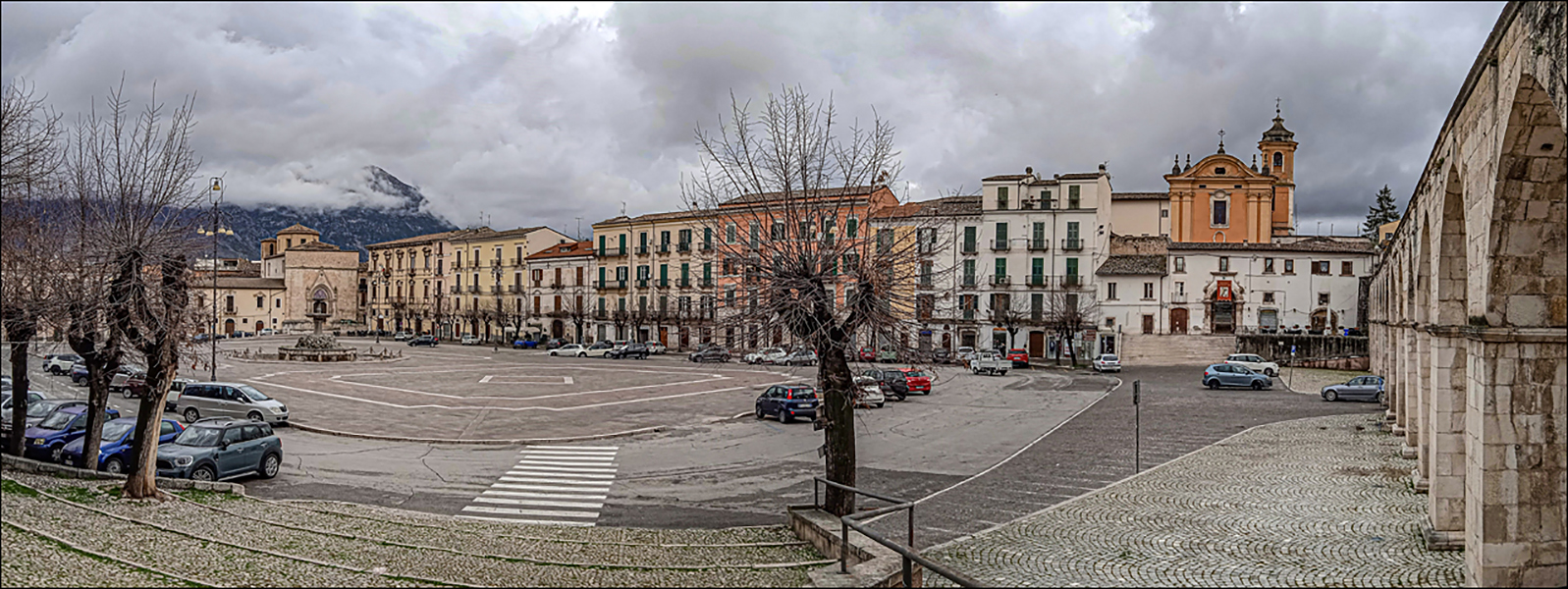Ezt követte a Complesso della Santissima Annunziata hatalmas épülete, majd elértük a középkori vízvezetéket, amely a Garibaldi tér egyik oldalát szegélyezi. A tér mögött a Majella hegység veszett el a felhőkben. Eléggé felhős, csepergő esős időjárás volt, a városban sem volt nagy élet.