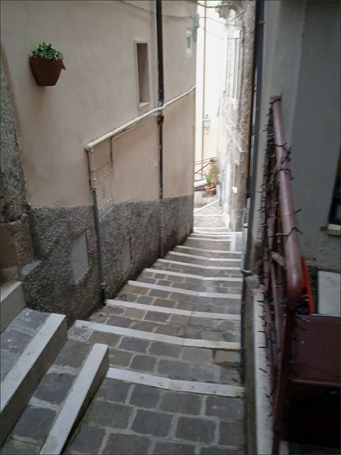 A ház egy nagyon keskeny sikátorban épült – amit egyébként tudtunk is, a belső terei tényleg nem voltak nagyok, szintenként kb. 25 négyzetméteresek. Ezekben ugye a lépcső is mindig benne van, ami általában keresztülvisz ezeken a tereken, így túl sok elvonulásra alkalmas hely nincs ezekben a házakban. A fürdőszobát a legalsó szinten alakították ki, a hálószoba viszont a legfelső szinten volt, középen a konyha... Persze ezt is tudtuk, de azt most tapasztaltuk csak meg, hogy a legfelső szintre vezető lépcsők nagyon meredekek, és szűkek, a lépcsőfokok pedig elég nagy változatosságot mutattak magasságban és szélességben egyaránt. Ezeket lehet orvosolni, de elég sok munkával, teljes átalakítással, és az amúgy is elég szűkös hasznos alapterület további csökkentése árán. Ami a legfőbb bajunk volt, hogy a csodás kilátás sem volt meg, csak egy bizonyos, oldalirányú szögből lehetett látni a környező hegyek egy kis szeletét, azt is csak a legfelső emeletről. Persze a hirdetést ezzel a képpel illusztrálta Sara, de sajnos a valóság inkább az volt, hogy ha egy nagyobbat nyújtóztunk volna, elértük volna a szemben levő ház tetejét. Abba is bele kellett gondolnunk, hogy hogy juttatunk el építőanyagot, bútorokat a házhoz, sőt, fel az emeleti helyiségekbe. Igaz, bizonyára az olaszok is megoldják ezt valahogyan.