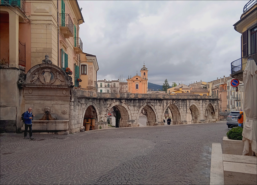 Ezt követte a Complesso della Santissima Annunziata hatalmas épülete, majd elértük a középkori vízvezetéket, amely a Garibaldi tér egyik oldalát szegélyezi. A tér mögött a Majella hegység veszett el a felhőkben. Eléggé felhős, csepergő esős időjárás volt, a városban sem volt nagy élet.